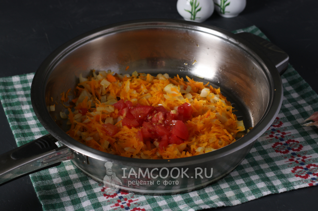 В сковороде разогреть растительное масло, пассеровать лук с морковью до мягкости, добавить помидор.