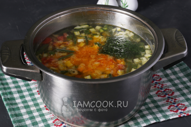 Вслед за кабачками отправить в суп остальные овощи и пассеровку со сковороды. Варить всё вместе 5 минут. Добавить измельчённый укроп и чеснок. Суп поперчить, снять с огня, дать настояться под крышкой 15-20 минут.