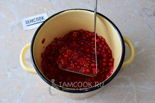 Ягоды красной смородины отделите от веточек, удалите листики и помойте. Поместите ягоды в кастрюлю, в которой будете варить кисель. Немного разомните их толкушкой, чтобы они пустили сок.
