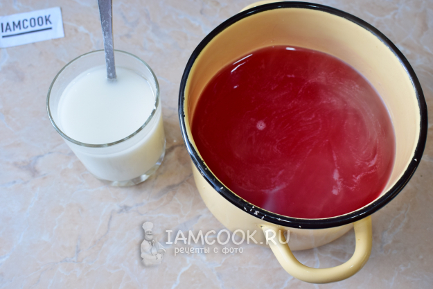 Процеженный напиток перелейте назад в кастрюлю и снова доведите до кипения. В кипящий напиток тонкой струйкой вливайте крахмал и сразу перемешивайте.