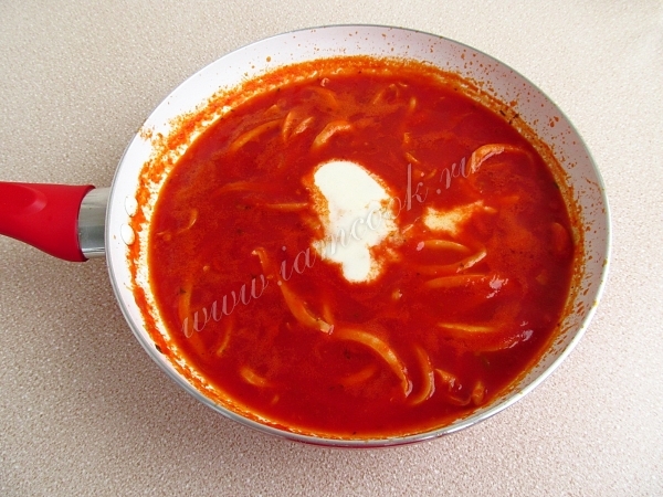Добавить сливки. Соус перемешать, довести до кипения и снять с плиты.