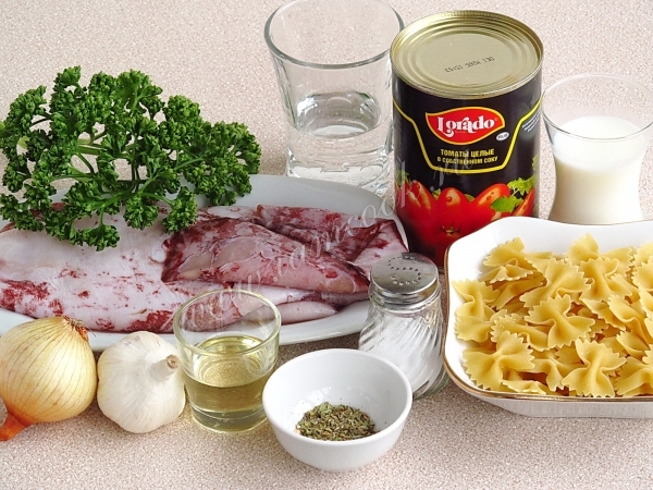 Для приготовления блюда нужно взять сухую пасту «фарфалле» («бантики»), свежемороженые кальмары, луковицу, чеснок консервированные томаты в собственном соку, сливки высокой жирности, сухую пряность «орегано», воду, масло подсолнечное рафинированное, зелень петрушки и соль.