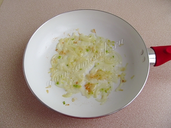 Лук выложить на сковороду с разогретым маслом и обжарить до мягкости.