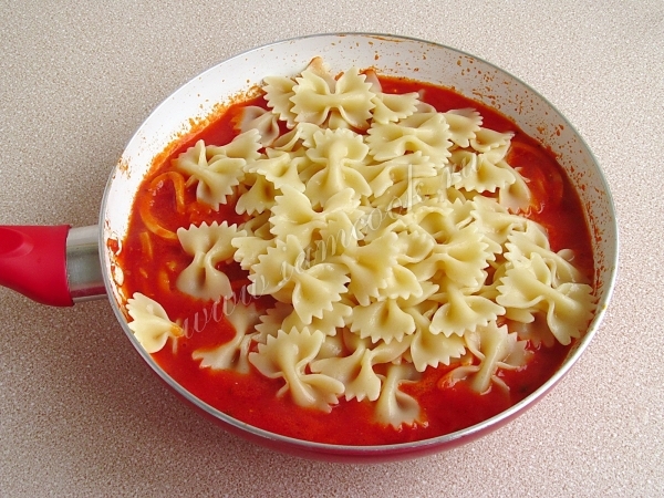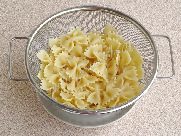 Пасту отварить по инструкции на упаковке до упругого состояния и откинуть на дуршлаг.