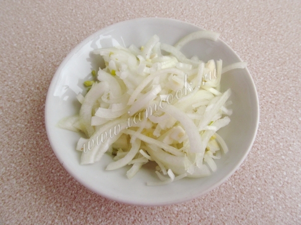 Луковицу очистить, разрезать пополам, а затем каждую половинку нашинковать тонкими полукольцами.