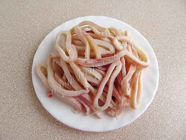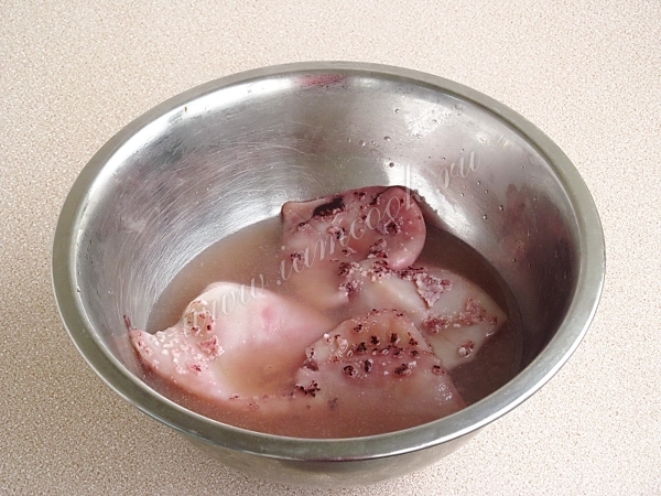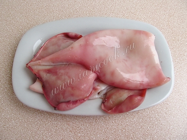 Из тушек кальмаров удалить жёсткие пластинки и все оставшиеся внутренности, а затем тщательно промыть и опустить кальмары в кипяток на 2 минуты.