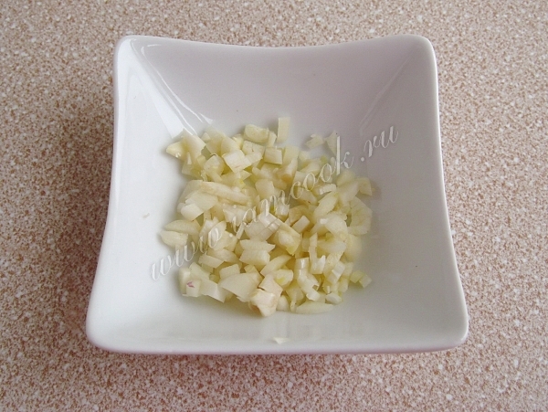 Дольки чеснока очистить от сухой оболочки и мелко порубить.