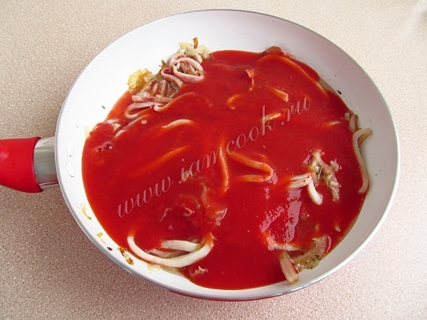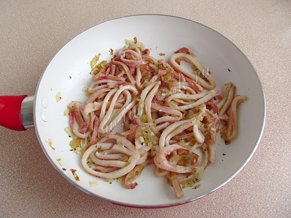Выложить в сковороду порезанные кальмары и обжарить на слабом огне в течение 5 минут.