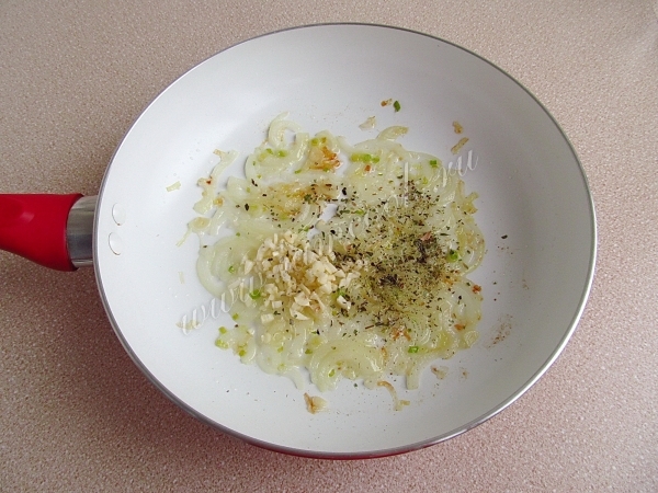 Добавить к луку чеснок и орегано обжарить всё вместе в течение 1 минуты.