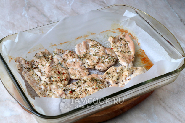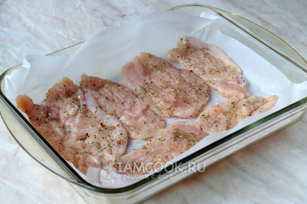 Затем выложите отбивные в жаропрочную форму, предварительно застелив её пергаментом или фольгой. Помните, мясо должно лежать в один слой!