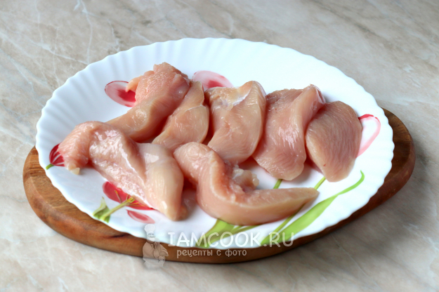 Куриное филе тщательно помойте под холодной проточной водой, обсушите бумажным полотенцем и нарежьте на небольшие пластины, толщиной около 2 см (как на фото).