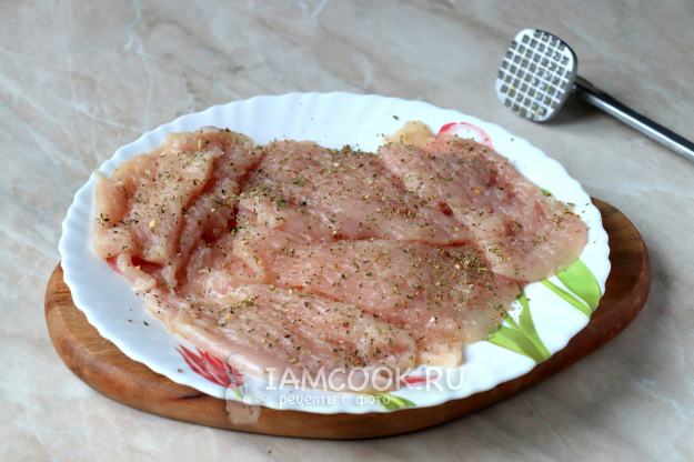 Затем мясо выложите на разделочную доску, накройте пищевой плёнкой, чтобы брызги не разлетались по всей кухне, и аккуратно отбейте кухонным молотком. Отбивные должны получиться тонкими, но при этом не разорваться и сохранить свою целостность.