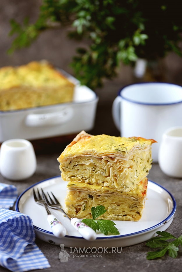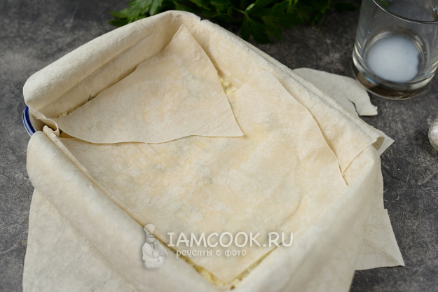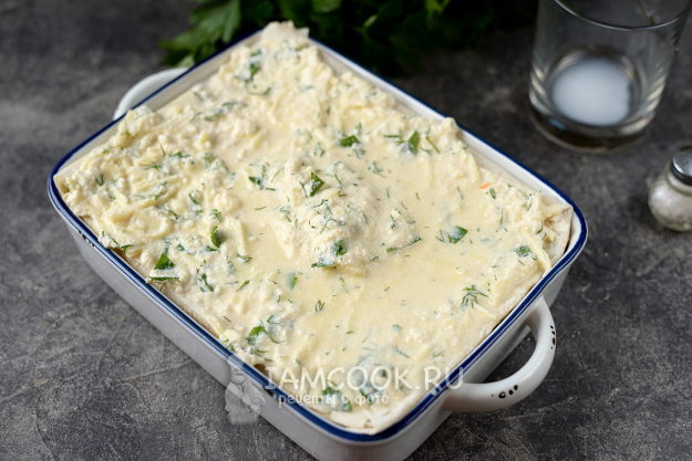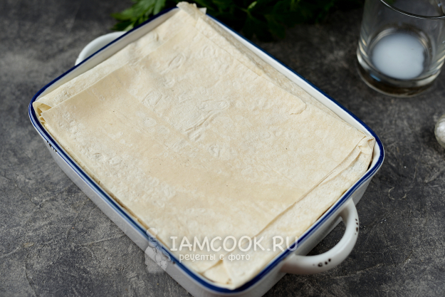 Оставшиеся лаваши нарежьте квадратами, обрезки используйте так же. Перекладывайте слои так часто, насколько хватит ингредиентов.