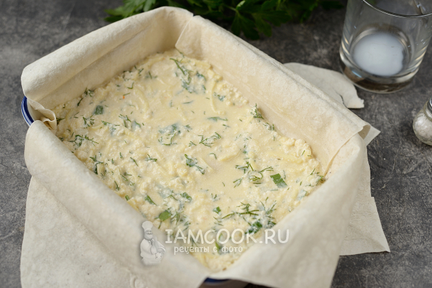 Часто в заливке используют кефир, но с ним и с соленым сулугуни начинка получается достаточно кислой и соленой одновременно, поэтому в нашем случае вливается молоко.