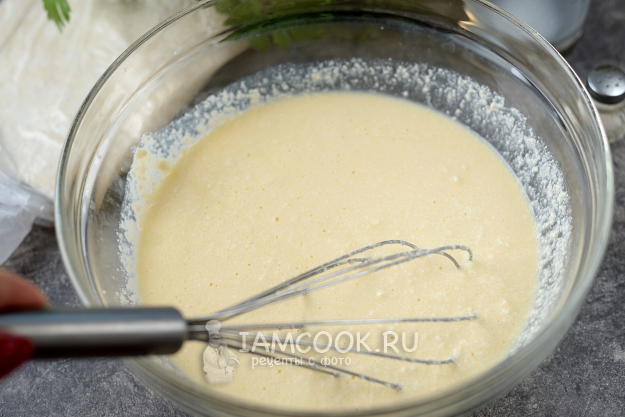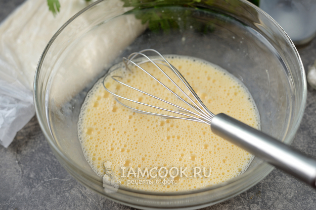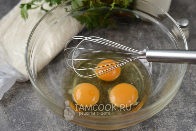 Сначала нужно приготовить заливку, для этого взбейте в глубокой миске три крупных яйца.