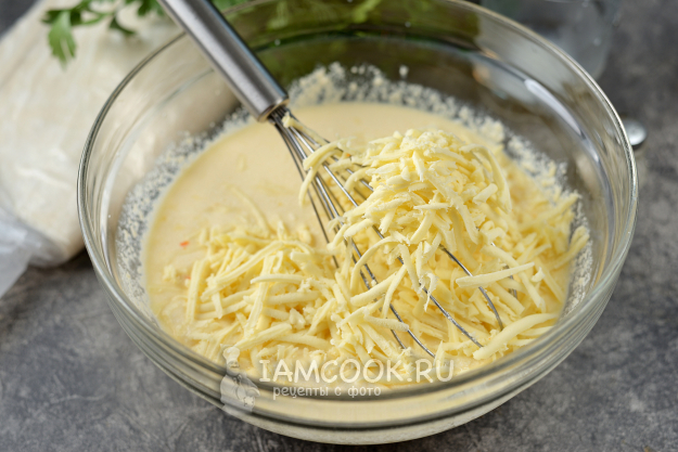 Теперь натрите сулугуни на крупной терке, смешайте венчиком.