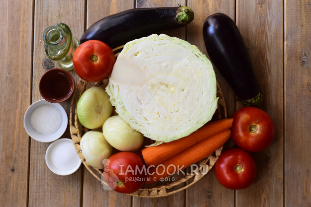 Подготовим ингредиенты для заготовки овощной солянки с капустой на зиму. Почистим лук, морковь. Все овощи тщательно вымоем. У баклажанов отрежем хвостики.
