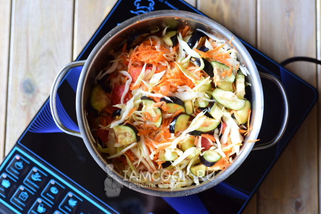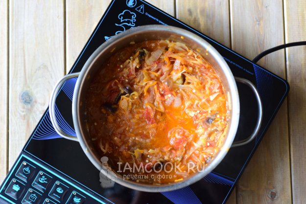 Перемешаем аккуратно все овощи деревянной ложкой и будем тушить на маленьком огне под крышкой 1 час, периодически помешивая овощную массу.