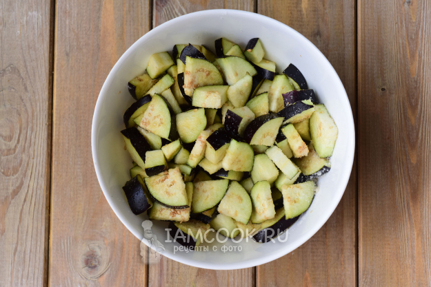 Баклажаны нарежем небольшими кусочками, выложим в миску, добавим соль и руками хорошенько все перемешаем. Отставим миску с баклажанами в сторону на 40 минут, таким образом мы избавимся от излишней горечи, свойственной баклажанам.
