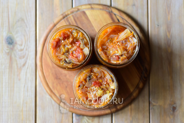 Закатаем и перевернем каждую баночку вверх дном, укутаем одеялом, оставим на ночь - овощная солянка с капустой на зиму готова.