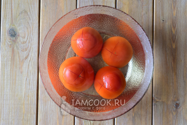 Помидоры все крестообразно надрежем острым ножом, выложим в миску и на 30 секунд зальем крутым кипятком.