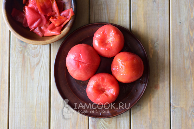После такой процедуры с легкостью снимем кожицу с каждого томата, удалим серединки.