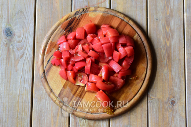 Мякоть помидоров нарежем небольшими кусочками.