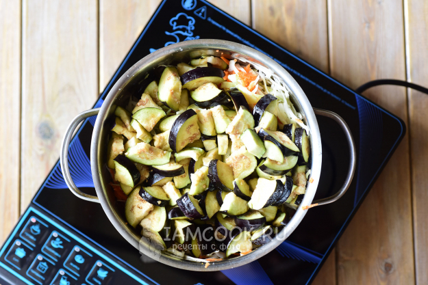 Добавим баклажаны вместе с солью (то есть не промываем дополнительно). Добавим сахар и растительное масло.