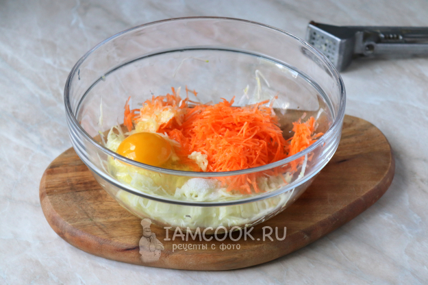 Измельчённые овощи посолите, добавьте к ним выдавленный через пресс зубчик чеснока и куриное яйцо. Перемешайте массу ложкой.