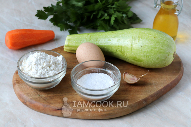 Для приготовления кабачковых оладий в мультиварке подготовьте продукты по списку. Кабачок помойте под холодной проточной водой, морковь и чеснок почистите.