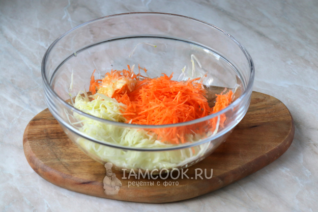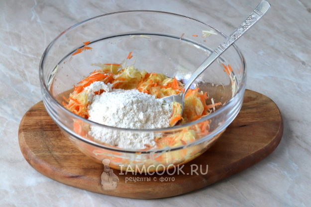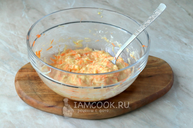 Морковь также натрите на тёрке и добавьте к кабачку.