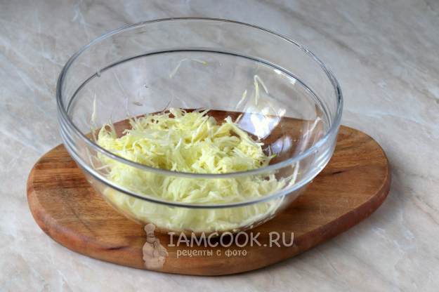 Кабачок натрите на тёрке со средними ячейками, если кожица твёрдая - можно её срезать. Из кабачковой стружки выдавите лишнюю жидкость, после чего выложите её в глубокую миску, удобную для замеса теста.