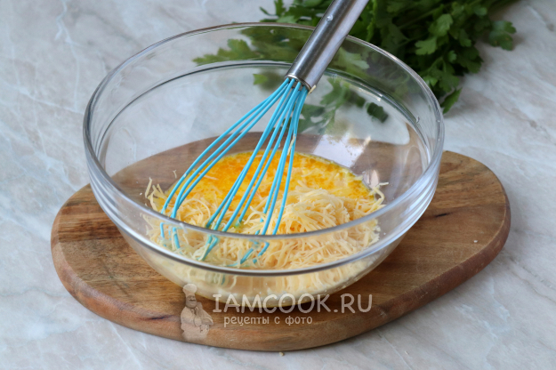 Твёрдый сыр натрите на тёрке со средними ячейками и добавьте его в яично-молочную массу. Перемешайте.