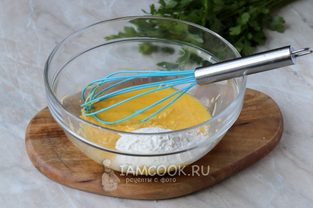 Затем введите пшеничную муку. Добавляйте её не всю сразу, а по столовой ложке, каждый раз хорошо перемешивая и контролируя консистенцию кляра.