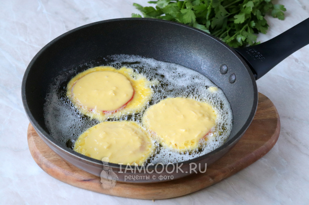 Затем кружочки окуните в кляр и выложите на разогретую с растительным маслом сковороду.