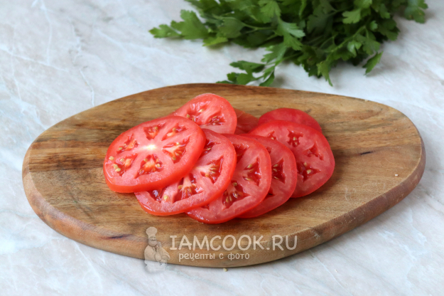 Помидор нарежьте тонкими кружочками и немного подсолите их.
