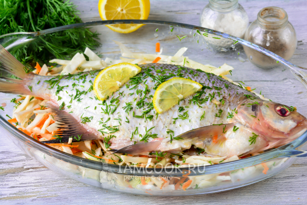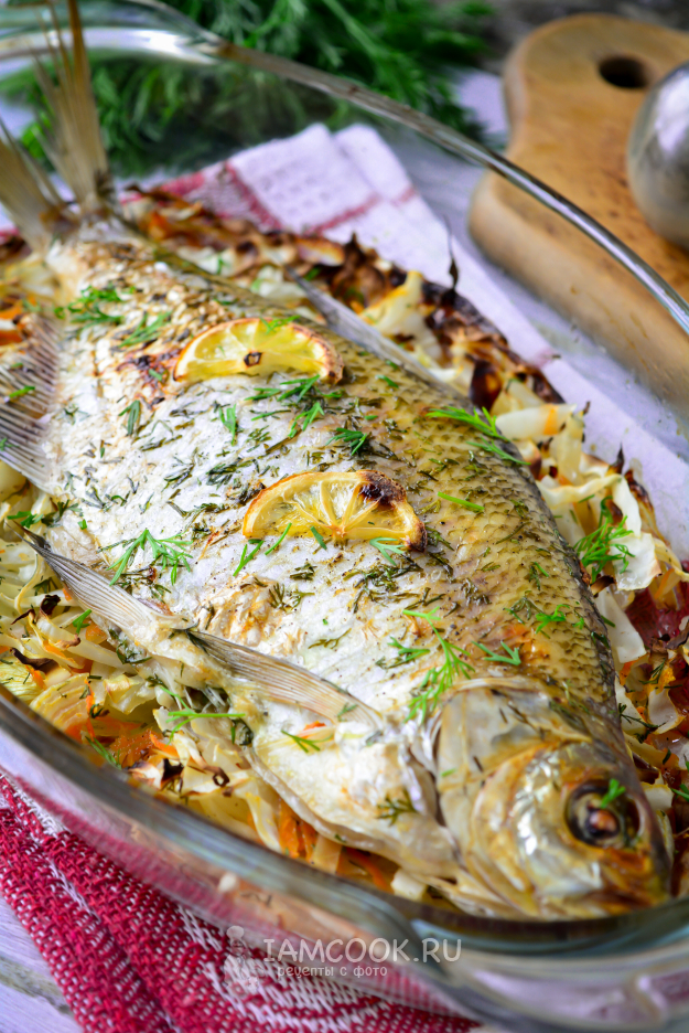 Сверху на овощи выложите леща, сбрызните его лимонным соком, полейте слегка маслом, присыпьте мелко нарубленным укропом. Поставьте рыбу запекаться в духовку.