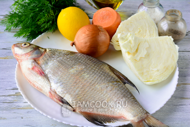 Подготовьте все ингредиенты для запекания леща с капустой в духовке.