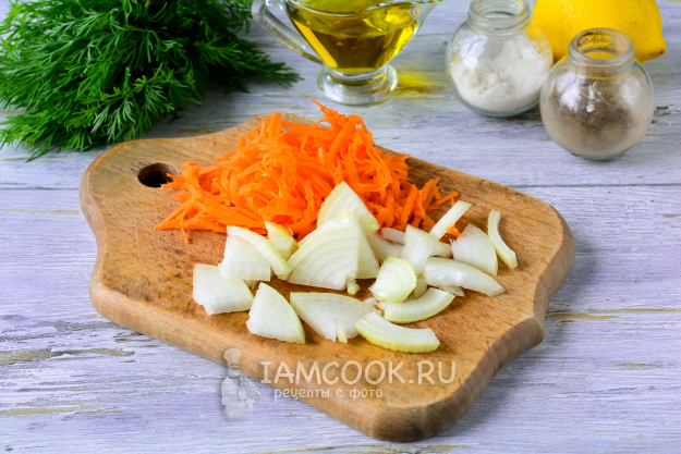 Морковку натрите на терке, а лук нарежьте четверть-кольцами.