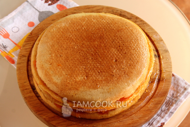 На трех коржах равномерно распределите абрикосовое варенье, щедро.