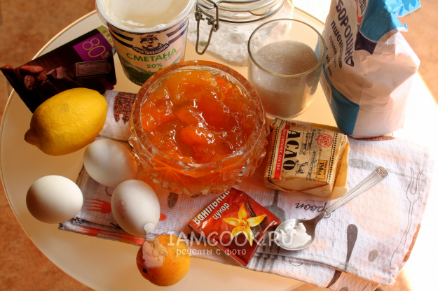 Для приготовления торта с абрикосовым вареньем в домашних условиях возьмите продукты по списку.