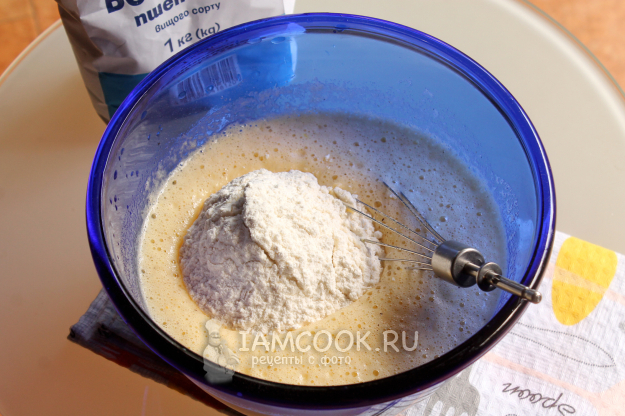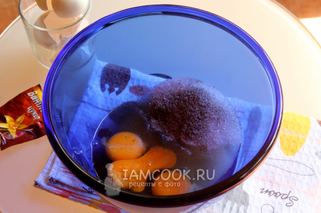 Сперва соедините в просторной емкости яйца, сахар, ванильный сахар. Взбейте миксером минуты 2-3.