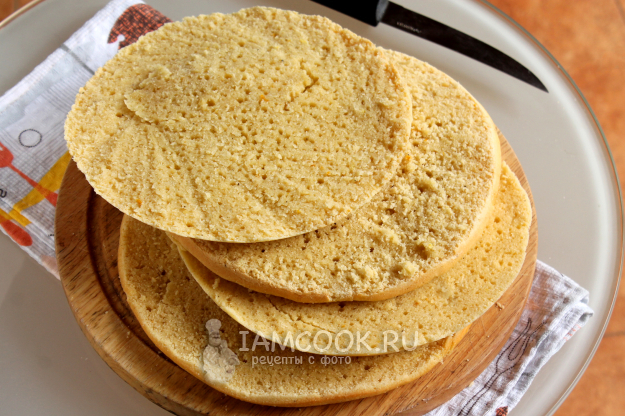 Коржи остудите и разрежьте, в итоге — 4 коржа. Неровности мякиша также срежьте, измельчите в крошку, чтобы потом обсыпать борт торта.
