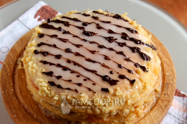 Липкий борт обсыпьте крошкой от коржей, по верхушке с помадкой проведите, например, линии растопленным черным шоколадом. Да, вышло не очень (: Украсьте абрикосовыми дольками из варенья. Для пропитки держите торт в холодильнике 1-2 часа.