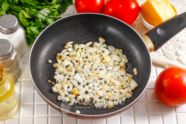 В это время очистите лук от кожуры и промойте его вместе с грибами. Нарежьте лук мелкими кубиками и отпассеруйте в 40 мл растительного масла до румяности, примерно 3-4 минуты.