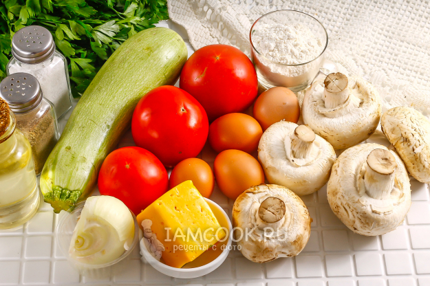 Подготовьте необходимые ингредиенты для создания аппетитного и красочного закусочного кабачкового торта с грибами, помидорами и сыром.