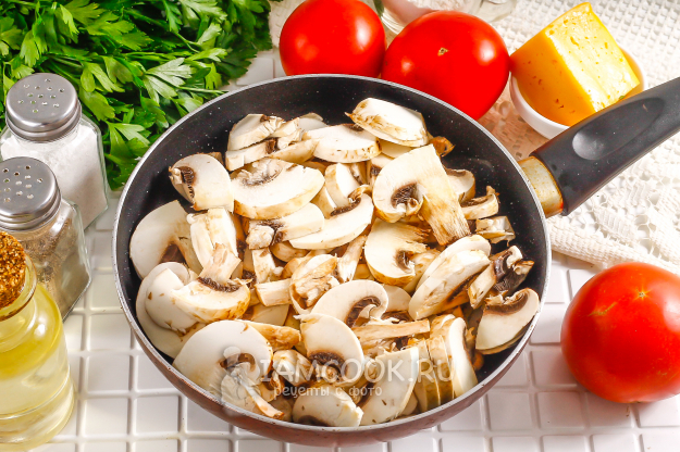 Нарежьте грибы слайсами и добавьте в емкость. Посолите и обжарьте до румяности примерно 12-15 минут.