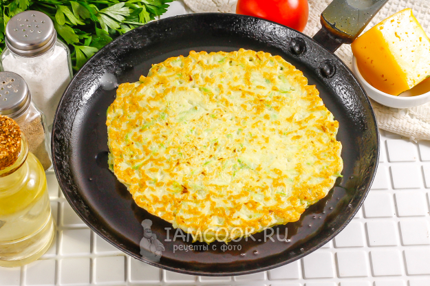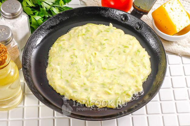 Прогрейте сковороду и смажьте ее маслом в первый раз. Выложите половник кабачкового теста на середину и распределите его ложкой или силиконовой лопаткой вокруг, чтобы блин не получился слишком плотным.