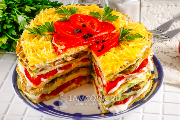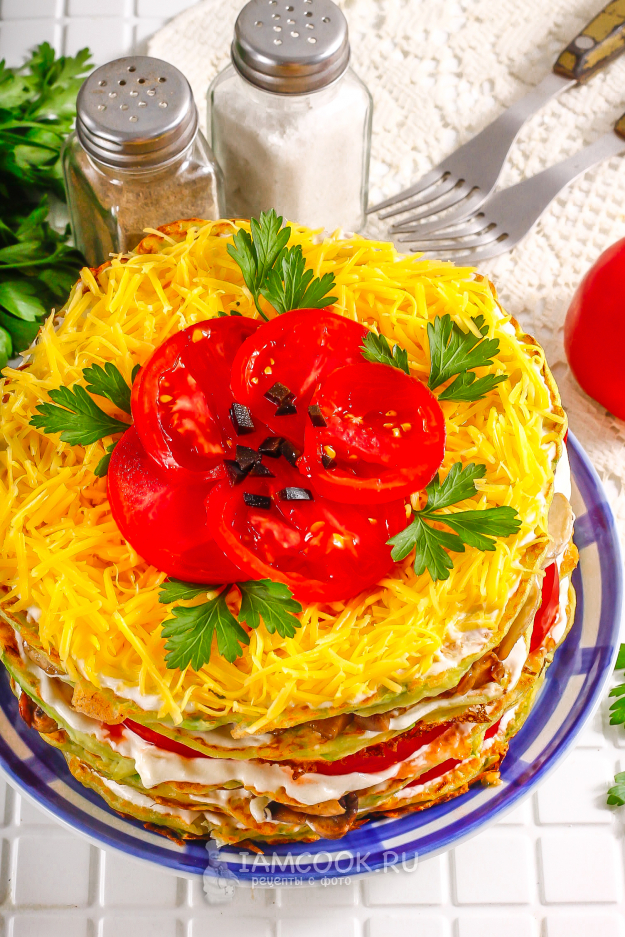 Кабачковый торт с грибами, помидорами и сыром готов. При подаче нарежьте его порционными кусочками.