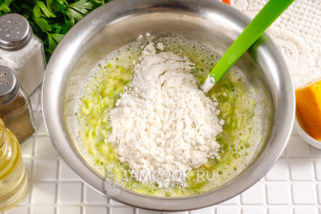 Всыпьте по частям муку и замесите неплотное кабачковое тесто. Влейте в него 50 мл оставшегося растительного масла и перемешайте.